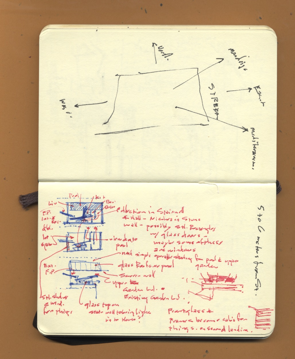 Anyway, the house is for a small site in Barcelona that has a four story building close to one side of it and a two story retaining wall about a fourth of the way into the lot. Fortunately, a garden could be placed around the side and front on the lower floor of the house, to achieve privacy and give a sense of the exotic and intimate.
